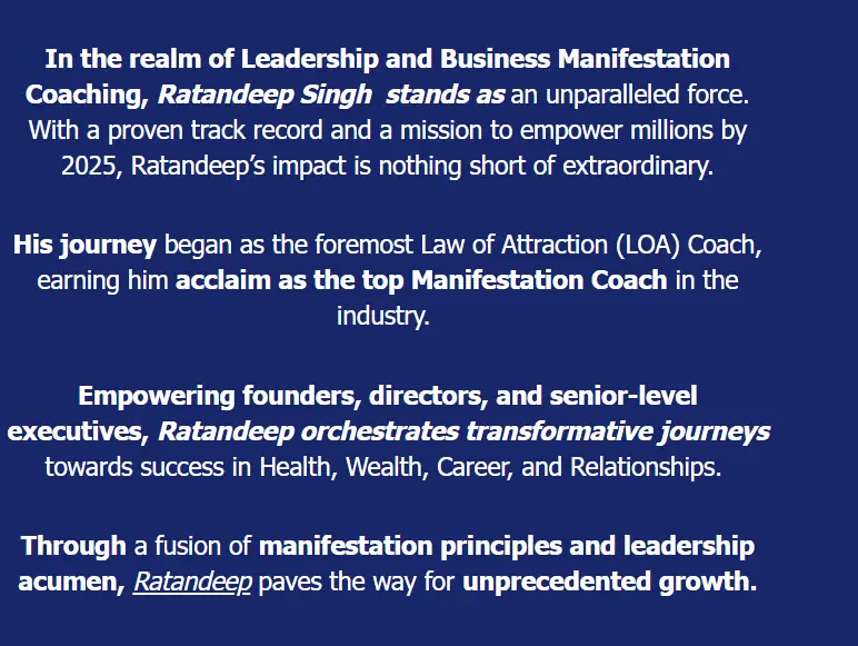 Ratandeep Singh's formal credentials emphasize his mastery in holistic coaching, leadership development, and cutting-edge manifestation strategies